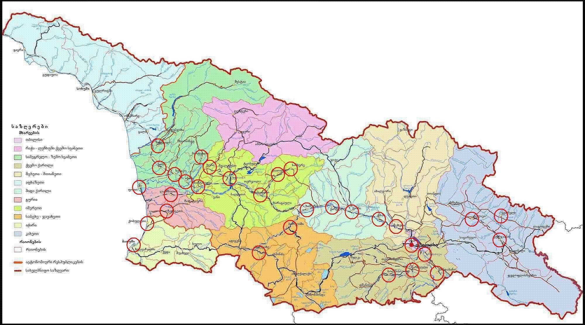 რუკაზე წითელი რგოლებით მონიშნულია ტერიტორიები, სადაც უზრუნველყოფილია ინტერნეტის წვდომა.